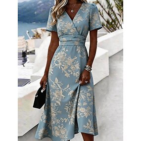 نسائي فستان ميدي فستان شيفت العطلة كاجوال بوهو مناسب للبس اليومي فستان صيفي فستان الربيع عادي ورد الرسم كم قصير V رقبة أزرق أحمر فاتح أزرق سماوي الصيف الربيع