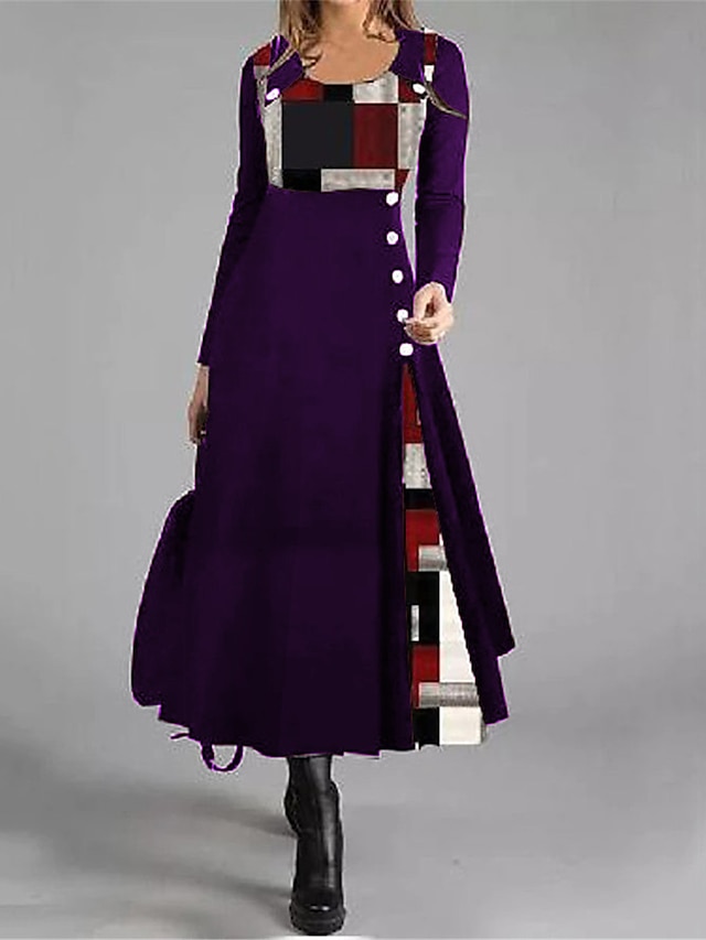 فستان نسائي كاجوال فستان على شكل حرف A بأزرار هندسية مرقعة بأكمام طويلة ورقبة دائرية أسود وأحمر مناسب للعمل في الخريف والشتاء ناعم ومريح عادي