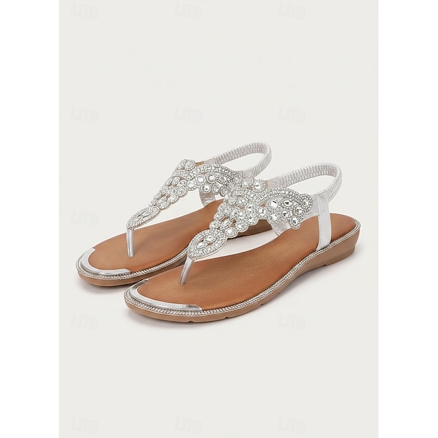 صندل نسائي بني مزين على طراز بوهو - حذاء مسطح مزين بالكريستال مناسب للمهرجانات الصيفية ورحلات الشاطئ والتجمعات غير الرسمية