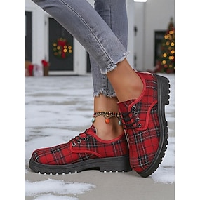 حذاء أكسفورد نسائي أحمر منقوش برباط، حذاء كاجوال بنمط تارتان عتيق، مثالي لملابس الكريسماس والأزياء الشتوية والتجمعات في العطلات