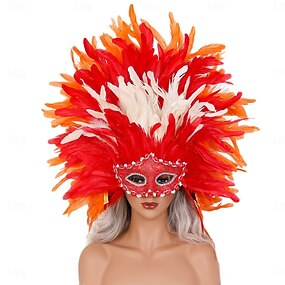 Carnival Accessories Carnival Feather Mask Headpiece Red, Orange & White Full Feathered Masquerade Mask for Parties Costumes
