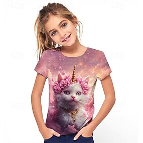 Girls' 3D Graphic Cat T shirt Tee Short Sleeve Summer Spring Fashion Basic Kids 4-12 Years Crew Neck Outdoor Casual Daily Regular Fit