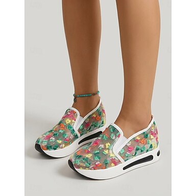 Dámské zelené nazouvací tenisky s květinovým vzorem a síťovinou – lehká prodyšná bota na platformě na cesty, do zahrady &denní nošení