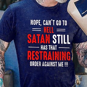 Vtipné pánské grafické tričko 'Ne nemohu jít do pekla Satan má na mě soudní zákaz' design se slovní hříčkou