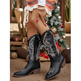 Dámské džínové kovbojské boty western - vintage špičaté boty s vyšívaným podpatkem do poloviny lýtek, klasický americký kovbojský styl pro country festivaly a rodeo párty