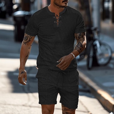 Pánské 2 kusy Waffle Henley košile Tričkové obleky Tepláková souprava Krátký rukáv Krátké rukávy Krátké kalhoty Henley Léto Pevná barva Kreslení gymnastika Na běžné nošení 2 ks Dovolená Denní nošen