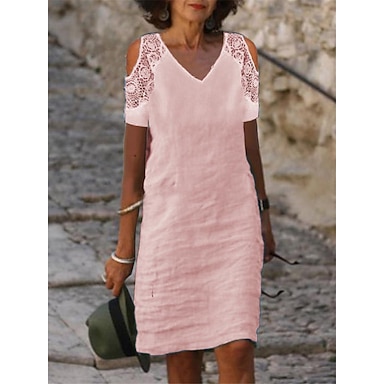 Dámské Midi šaty Imitace bavlny a lnu Úpletové šaty Bílé šaty Krajkové šaty Základní Na běžné nošení Denní Venkovní Volný Čistá barva Krátký rukáv Do V Černá Bílá Světlá růžová Oranžová Léto Jaro