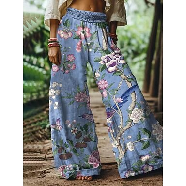 Dame Bredt Bukseben Bukser Palazzo bukser Mode Boheme Fuld længde Høj Talje Blomst Snørelukning Elastisk Talje Trykt mønster Åndbarhed Bekvem Gade Dagligdagstøj I-byen-tøj Blå Forår Efterår Regulær