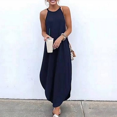Dame Maxikjole Skift Kjole Sommerkjole Kjoler i bomuldshør Hverdagskjole Basale Moderne Daglig Weekend Løstsiddende Vanlig Uden ærmer Rund hals Krave Blå Hvid Navyblå Kakifarvet Sommer Forår