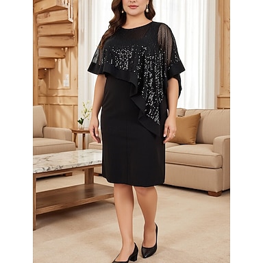 Tube kolonne Knælang Festkjole Cocktail Kjole Gæstekjole til bryllup Kjole til brudens mor Halvlange ærmer Rund hals Lille sort kjole Plusstørrelse Glitrende Formel aften Bryllupsfest Chiffon
