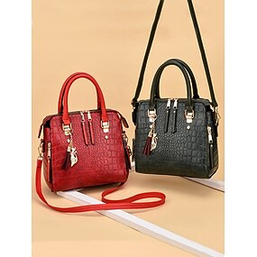 Damehåndtaske med krokodillemønster i imiteret læder og kvastvedhæng – elegant håndtag foroven og crossbody-taske til arbejde, shopping og daglige udflugter