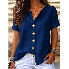 Dame Skjorte Bomulds Blanding Linned skjorte Boho skjorte Helfarve Vanlig Årgang Stilfuld Kortærmet V-hals Lange toppe Daglig udendørs Streetwear Blå Sommer Forår