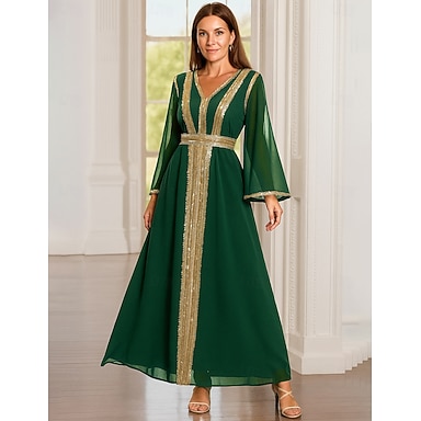 A-Line Sheath Kolonne Gulvlængde Bryllup Gæst Kjole Formelle Kjoler Aften Kjole Mor til Bruden Kjole Lange Ærmer V-Hals Elegant Vintage Luksuriøs Formelle Spandex Pailletteret med Paillet