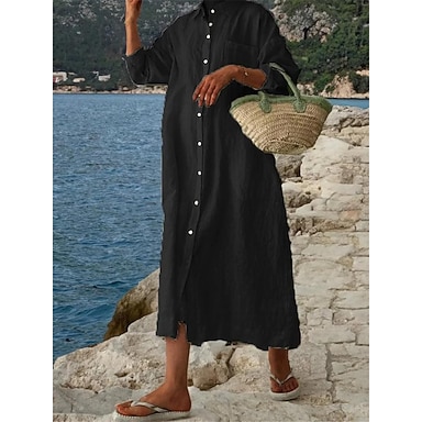 Dame Midikjole Hvid kjole Kjoler i bomuldshør Skjortekjole Hverdagskjole Basale Moderne Daglig Weekend Løstsiddende Vanlig 3/4-ærmer Krave Sort Hvid Lyserød Navyblå Sommer Forår