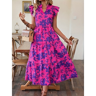 Dame Maxikjole Hverdagskjole Skift Kjole Stilfuld Afslappet Ferierejse Daglig Stævnemøde Løstsiddende Blomstret Kortærmet V-hals Lyserød Blå Sommer Forår