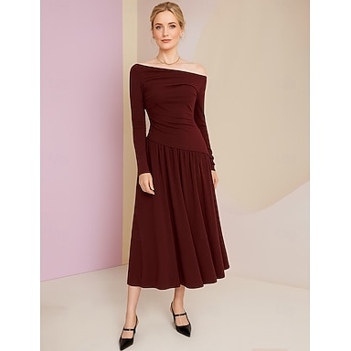 A-linje Te-længde Festkjole Cocktail Kjole Gæstekjole til bryllup Kjole til brudens mor Kortærmet Skulderfri Elegant Årgang Fest Ferie Formel aften Bryllupsfest med Plissé