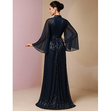A-Linie Gulvlængde Bryllupsgæstkjole Formelle Kjoler Aftenkjole Mor til Bruden Kjole Lange Ærmer Høj Hals Elegant Vintage Glitret Skinne Spandex med Pailletter