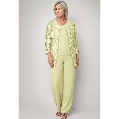 Pantsuit 3 -dels jakkesæt Gulvlang Kjole til brudens mor Langærmet Rund hals Elegant Formel Bryllupsgæst Chiffon Indpakning inkluderet med Blonde Broderi