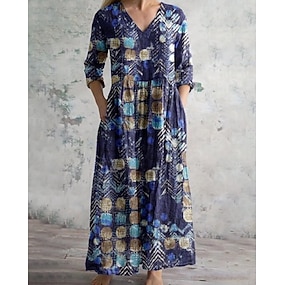 Dame Midikjole Imiteret bomuldslinned Skift Kjole Hverdagskjole Basale Klassisk Afslappet Daglig udendørs Ferierejse Regulær Vanlig 3/4-ærmer V-hals Blå Hvid Grøn Sommer Forår Efterår