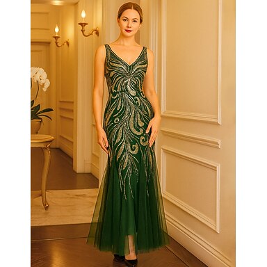 Havfrue Ankellængde Perlebroderet Gæstekjole til bryllup Formel kjole Kjole til brudens mor Uden ærmer V-hals Elegant Årgang Glitrende Formel aften Bryllupsfest Tyl med Perlearbejde