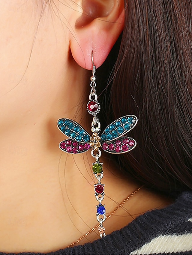 : Med et fængslende libelle-motiv er disse øreringe designet med en blanding af strålende blå og pink sten på vingerne og en fantastisk gradient af grønne, røde, blå og amber sten på kroppen. De detaljerede udsmykninger og den legende brug af farver gør disse øreringe til et iøjnefaldende stykke i enhver smykkesamling.