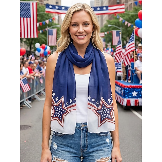 Patriotisk polyester chiffontørklæde til kvinder, let, åndbart stjerneprint modetørklæde til amerikansk 250-års fejring, uafhængighedsdag, dagligt fritidstøj og ferierejser