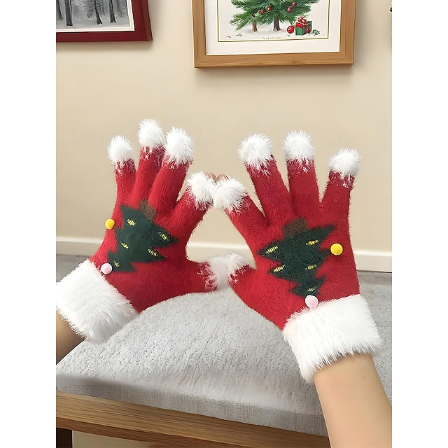 Julestrikkede damehandsker med bløde manchetter og juletræsdesign, varme vintervanter til voksne og børn, sød gaveidé til fest