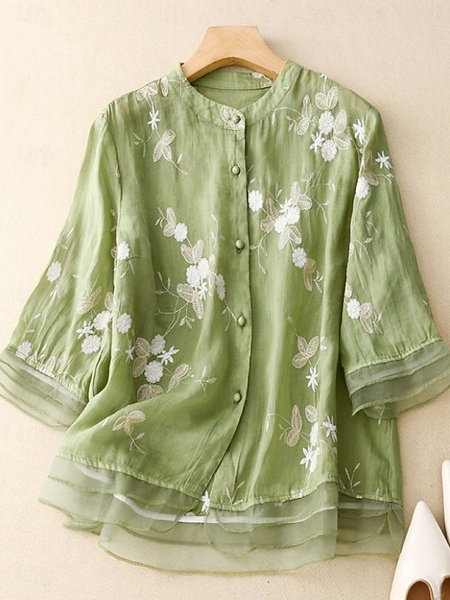 Dame Skjorte Knap op Bluse Imiteret bomuldslinned Broderi Knapper Blomstret Basale Afslappet 3/4-ærmer Højhalset Almindelige toppe Daglig Gul Lilla Grøn Beige Sommer Forår Efterår