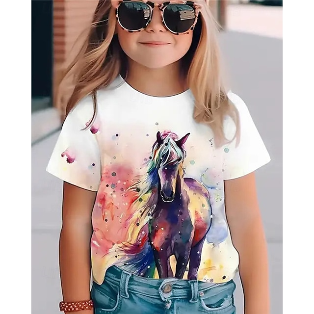 Pige 3D Hest T-shirt Kortærmet Sommer Forår Mode Basale Børn 4-12 år Rund hals udendørs Afslappet Daglig Regulær