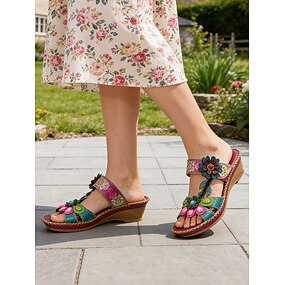 Lilla damesandaler med kilehæl i ægte læder med blomsterprint | bløde, komfortable sandaler med åben tå til gåture, havefester og afslappet hverdagsbrug