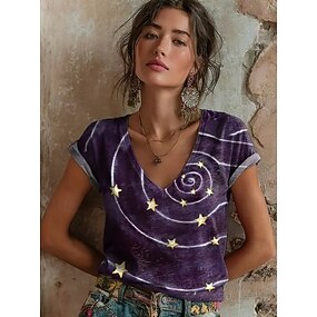 Dame T-shirt Trykt mønster Grafisk Abstrakt Geometri Årgang Stilfuld Klassisk Kortærmet V-hals Almindelige toppe Afslappet Daglig I-byen-tøj Blå Lys beige Lysegrøn Lys Lilla Lilla Sommer Forår