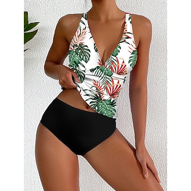 Damen Badeanzug Bikini Tankini Zweiteilig Freche Unterhose Bademode Tiefes V Push-Up Gestrickt Urlaub Tropisch Blumen Farbblock Stürzen Ärmellos Badeanzüge