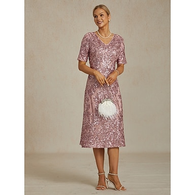 Damen Midikleid Shiftkleid Elegant Party Party Hochzeit Pailletten Bestickt Glitzer Normale Passform Blumen Kurzarm V Ausschnitt Erröten Sie Rosa