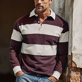 Herren Gestreift Pullover Rugby-Poloshirt Rugby-Poloshirts Langarm Polo-Shirts Kragen Vintage Lässig Outdoor Straße Alltagskleidung 3D-Druck Knöpfe Frühling Herbst Winter Kastanienbraun Schwarz Blau