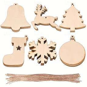 60 Stück DIY-Weihnachtsschmuck aus Holz zum Aufhängen am Weihnachtsbaum, Holz, DIY-Kunsthandwerk, 6 Designs, Weihnachtsbaumglocken, Rentier-Weihnachtsstrümpfe, Schneeflocken, runder Weihnachtsschmuck