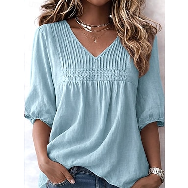 Damen Hemd Baumwoll-Leinen-Hemden Leinenhemd Einfach Täglich Stilvoll Basic Dreiviertelarm Laternenärmel V Ausschnitt Normale Oberteile Täglich Arbeit Ferien Blau Schwarz Khaki Frühling Herbst