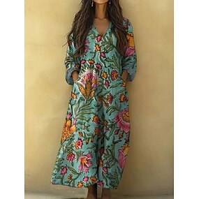 Damen Maxikleid A Linie Kleid Lässig Täglich Normale Passform Blumen Dreiviertelarm V Ausschnitt Blau Grün Aprikose Beige Sommer Frühling Herbst