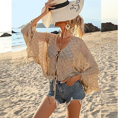 Damen Boho-Hemd Spitzenbluse Tunika Oberteil mit Ösen Kordelzug Gehäkelt Einfach Urlaub Strand Glockenärmel V Ausschnitt Täglich Straße Schwarz Weiß Khaki Sommer
