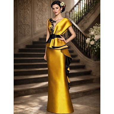 Schlauchkleid Bodenlang Kleid für Hochzeitsgäste Abendkleid Brautmutterkleid Kurzarm V Ausschnitt Elegant Formell Hochzeitsgast Herbst Satin mit Rüschen Stickerei Applikationen