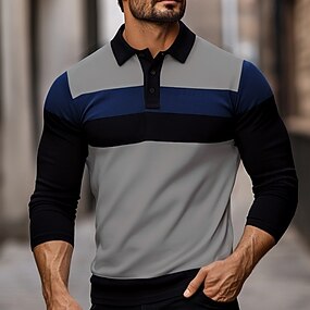 Herren Farbblock Rugby-Poloshirts Langarm Polo-Shirts Gerippter Polokragen Mode 3D-Druck Bequem Formell Arbeit Lässig Knöpfe Herbst Winter Wein Gelb Grau