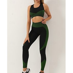 Damen 2 Stück Yoga-Trainingsanzug Lounge-Outfits Nahtlose Sport-BH-Leggings Patchwork Farbblock Kombination Sommer Wasserblau Armeegrün Fitnesstraining Hohe Taille Elastisch Atmungsaktiv Ärmellos