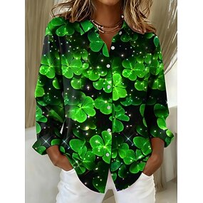 St. Patricks Day Damen Bluse Knöpfe Druck Grafik Kleeblatt Vintage Stilvoll Lässig Langarm Hemdkragen Normale Oberteile Täglich Arbeit Schwarz Weiß Hellgrün Grün Sommer Frühling Winter