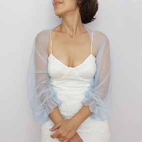 Mesh Bolero Lange Puff Rüschenärmel Durchsichtige Überblende Shrug Tüll Bolero Braut Organza Hochzeitsgast Mode Frauen Wrap Sonnenschutz All-Match Frühjahr Sommer Kleid zum Beeindrucken