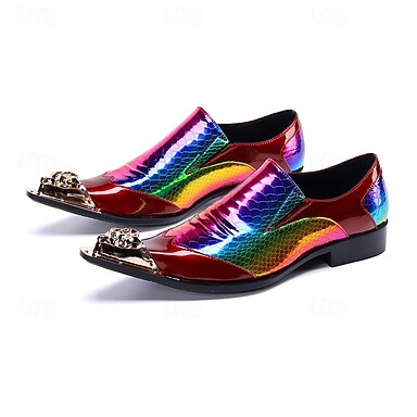 Regenbogenfarbene Metallic-Lederschuhe für Herren mit Schlangenmuster und spitzer Zehenpartie – exklusive Schuhe für Modenschauen und Partys