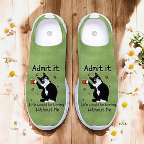 Grüne Slip-On-Sneaker für Damen mit lustigem Katzen-Aufdruck, perfekt für den Alltag