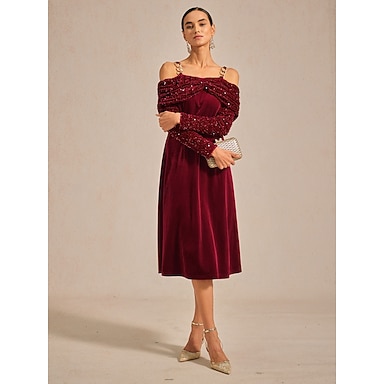 Weihnachten Damen Midikleid Schulterfreies Kleid Elegant Party Cocktailparty Gerafft Pailletten Glitzer Normale Passform Einfarbig Langarm Schulterfrei Wein