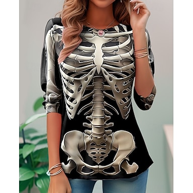 Damen T-Shirt Skeleton Schädel Grafik Skelett Vintage Mode Stylisch Langarm Rundhals Reguläre Oberteile Täglich Wochenende Druck Schwarz Wein Dunkelgrau Sommer Frühling Herbst