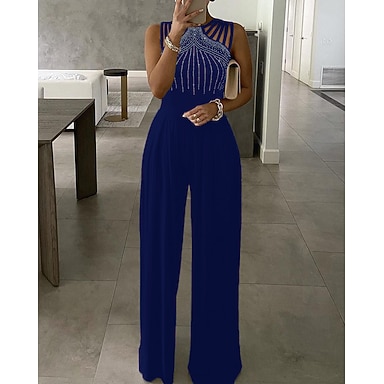 Damen Normal Overall Elegant Einfarbig Ärmellos Weites Bein Rundhalsausschnitt Perlenbesetzt Hochzeit Party Normale Passform Schwarz Wein Blau Sommer
