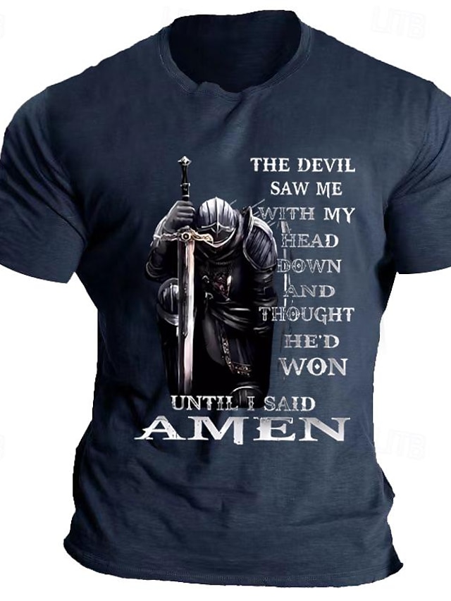 Herren Kurzarm Grafik T-Shirt Ritter  Zitat "Der Teufel sah mich... Amen" Glaubens Resilienz Motivation 2026 - $17.49 –P1