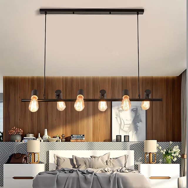 Die Pendelleuchte verfügt über ein lineares Design mit mehreren freiliegenden Edison-LED-Glühbirnen, die eine warme und einladende Atmosphäre schaffen. Verstellbare Kabel ermöglichen anpassbare Höhen beim Hängen, was sie an verschiedene Deckenkonfigurationen anpassbar macht. Das schlanke schwarze Finish ergänzt das Design und verleiht einen Hauch von modernem Chic.